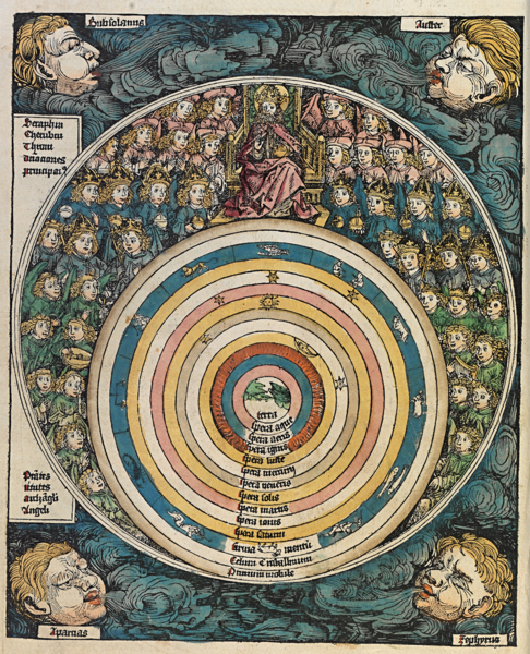 The image in figure 21 is supposed to represent what the universe looked like on day 7 - after God had finished creating everything. The only thing you need to concentrate on to understand what is going on - is the Celestial Sphere! Recall, that people at this point in human history believed that all the stars were the same distance away from the Earth - just in different directions. They believed they were all stuck on the Celestial Sphere at the edge of the universe. Beyond that was the perfect environment where God and the angels lived. The home of the stars - the Celestial Sphere - which acted as the dividing line, was represented by the signs of the zodiac. Thus, the blue layer with the 12 signs of the zodiac represents the Celestial Sphere - the dividing line between the physics of man; and the metaphysics of God!